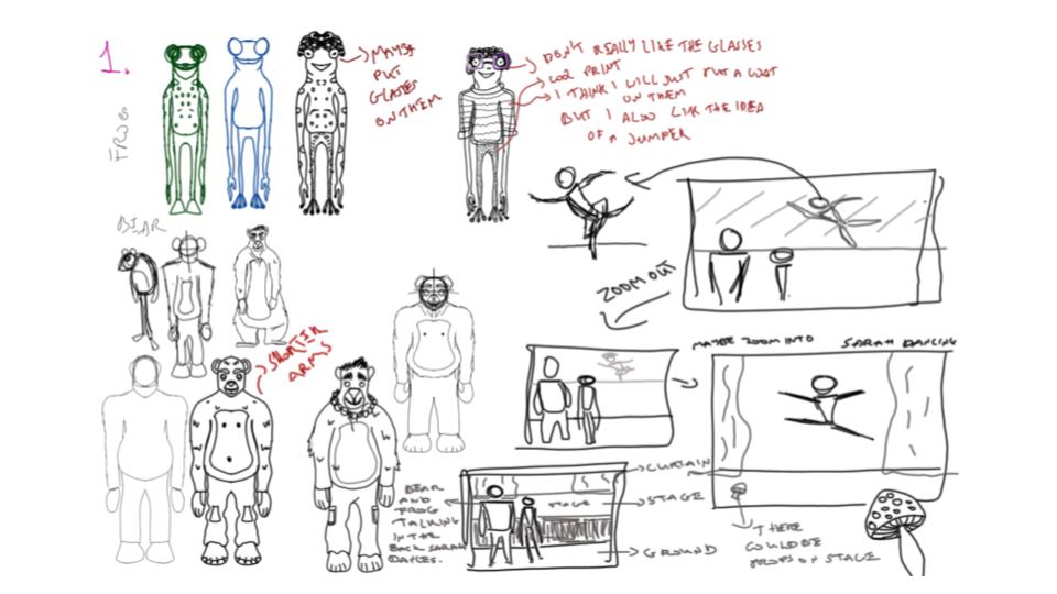 developed character designs I might still experiment with some colours and I dont like the frogs hair so I might change it.